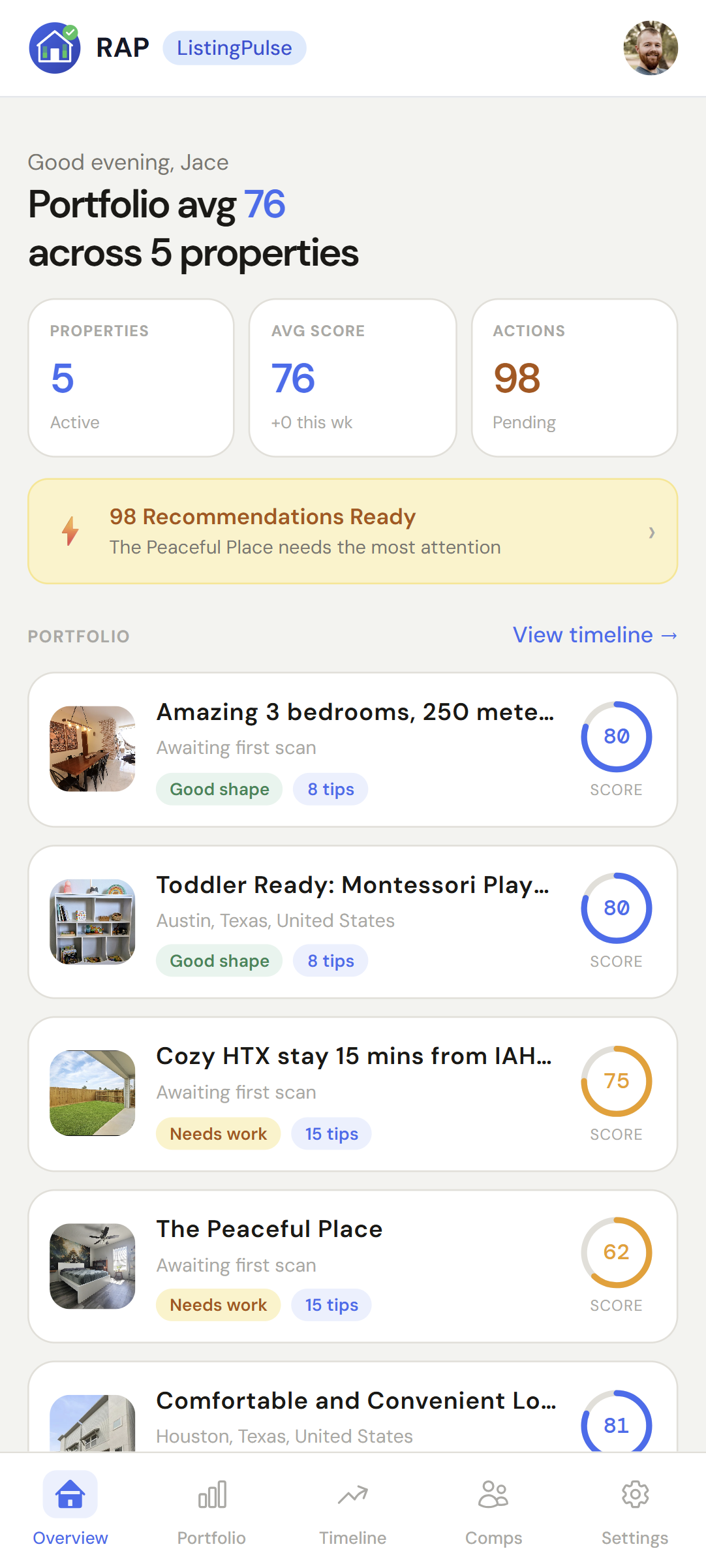 Your co-host updated your photos. Your PM tweaked your title. Airbnb quietly reordered your images. ListingPulse catches every change - and shows you exactly what it did to your score.